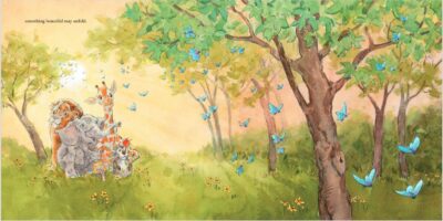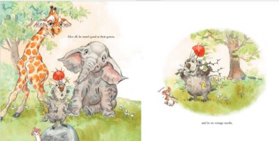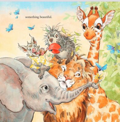 The tone is set as a “house that Jack built” by having each character introduced one by one (first the mouse, elephant, giraffe and so on). It is about being your true self, learning to play with others, and to embrace our differences as we all have things to add to the mix. Everything is tenderly presented. Lita Judge has a tone to their story that is sweet, silly, and familiar. You are reading a cozy, comfortable, relatable story.