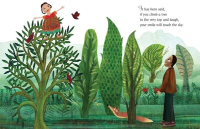 The illustrations are by Mehrdokht Amini. And they are something else, for sure. As I said, we have a young girl with large, brown, eyes. A father with an oddly shaped head. We have gossipy women with necks so thin I am afraid their heads will tip over and topple off. There are angels with a side view so only one eye can be seen. And there are the bold, beautiful, powerful colors of golds and teals of the mothers clothing, the red and orange and greens of the little girl’s dress, the deep blue of the night sky. There are purples, reds, oranges, blues, and all the colors. Even the darker images are bold and strong. Making the colors pop even more. After a bit, I actually started to get into the art and appreciate the uniqueness of it. They are not all my favorites, but I did see how they are what was needed to make this story fresh and fun.