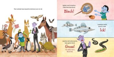 And good thing I am not a vampire, as learning about blood in Blood! Not Just a Vampire Drink also by Stacy McAnulty would have made me thirsty, too. Maybe it is not as funny as McAnulty’s brains/zombie book, but it is equally as good. The ins and outs of our blood (while a very thirsty count waits not so patiently for a drink) are presented by a young vampire. This narrator hearts blood! But inside humans. And has a special treat for the count (though spoiler, I would recommend a strawberry shake, closer to the color needed). The illustrations of Shawna Tenney are equally amusing, bright, and informative.