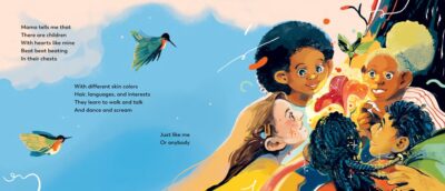 This is a book you must experience. This is mostly because of Molly Mendoza’s illustrations. No, this is artwork that should be framed. It would make great decorations for a child’s room or classroom. They are lush, and yes, flowing. The colors just explode. The details are strong, but sometimes it feels as if they “bleed together” showing the unity of everything and their dream like quality. If anything, the illustrations make the story for me.