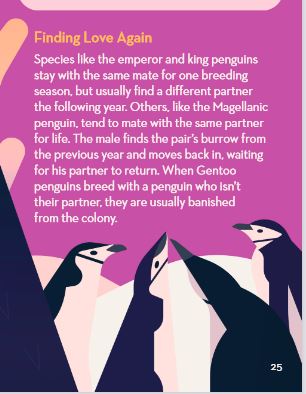 This and more polite facts, though there are some racy ones about the matting habits of penguins. I was blushing about the pebbles! And I thought all penguins were maters for life. Nope, not all of them. But there are types that will not tolerate “open relationships.” So, yes there are “mature themes” but done so I would have no problems giving to most kids at least five and up. (You can skip the mating stuff if you need to, or the poop stuff, but trust me, kids will LOVE it).
