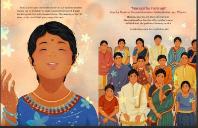 Who is the audience for this book? For certain the older child. This is not a usual book with “action and adventure” but a biography. Therefore, at least five and up would be the best bet. However, the seven and up would get much from it. The picture book format, however, might turn off some readers. It would be a good, but longer, read aloud. It could work for world history, history of India or women’s history. Music lovers of all ages will appreciate the look at a musical culture many westerners might not be familiar with.