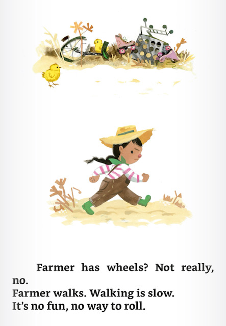 Wheels, No Wheels by Shannon McNeill is a silly-nonsense book that I would have easily incorporated into my pre-k transportation unit lesson plans. Starts with a very simple breakdown of things like “A tractor has wheels. A llama has no wheels.” and quickly devolves into the chaos that would occur if llama – and all the other farm animals – suddenly decided that they’d LIKE to have wheels. The illustrations do the heavy lifting here – watching the farmer girl trudge after all the wheeled animals on her slow little feet requires the grumpiness of her facial expressions to move this story along. It’s fast book, probably purposefully, but watching them all clamber into a van driven by a chicken at the end is a pretty good payoff. 3 Stars