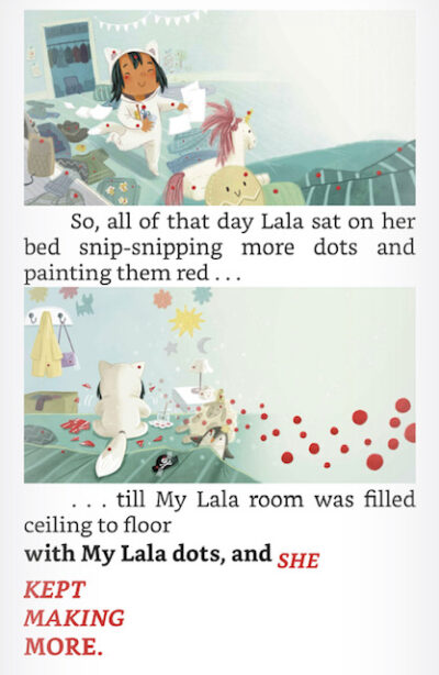 My Lala by Thomas King, illustrated by Charlene Chua is another quick read (I have a Kindle copy, but I’d be surprised if it was more than 10 pages). The illustrations are vibrant & fun & the intent of the book, based on the publisher’s copy is great -> “A joyful picture book about confidence featuring a little girl making her mark on the world.” But it reads a little … possessive? To me? And I’ve been thinking about it for a while now, and am no less conflicted.
