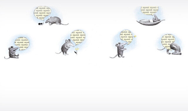 Another book that was also as true as it could be, Baby Squeaks by Anne Hunter seems to have hit the target head-on, however. There’s very little reading taking place in this book, but wow do the illustrations do a lot of the talking/explaining. Baby Mouse used to not know any words, but once they learned some words? They never stopped squeaking. Ever. So, one day when Mama Mouse just needs a tiny bit of quiet, she puts Baby Mouse outside the doorstop, still talking. And Baby Mouse finds some new friends to regale with their oratory.