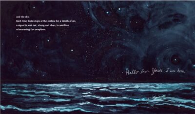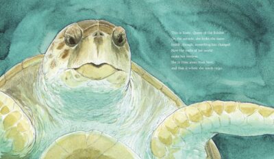 The gorgeous watercolors of the illustrations, also by Moore, is the icing on the cake. These images are fameworthy. The are richly colored and detailed. They show the themes conservation, oceanography, natural selection, the food chain, currents, geography along with the story of Yoshi.