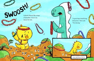 We follow a tiny monster that is a Kaiju. When they come of age, they get their own city to terrorize. Their own city that they can unleash their own, unique, special talent. And Anzu comes from a long line proud monsters. They can stomp, roar, and do what all good kaiju’s do. But our young friend Anzu’s special power is a little less than scary. After all, they can create flowers, and other happy goodies. They just have a big heart and really do not