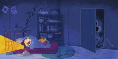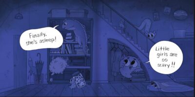 If you have followed What’s Up Beanie on Instagram or WebToons you know what a loveable stinker Alina Tysoe’s characters can be. In Emi Isn’t Scared of Monsters we have her signature style come alive when a young girl gets ready for bed. Flashlight? Check! Her dog Cookie? Check! Helmet? Check! Wait a minute, a helmet? Yes! Emi needs a helmet as she is getting ready to not sleep but keep an eye out for monsters! Baiting her trap, she and