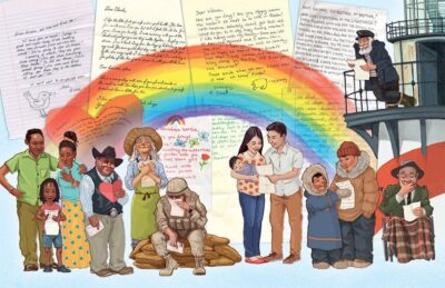 Artie loves hugs but cannot give one to her grandmother. Instead, she puts pen and pencil and marker, and you name it to page and creates a note to her grandmother. The way Artie tells us how the hug then must be given a special cover and how it travels is cute and funny, and informative. Did you know that hugs travel by train, boat and even planes? Not to mention by donkeys, handled by hug carriers and more. And we know our hug makes it, because sometimes you get a hug in return. This idea of a handwritten letter shows how we can connect with loved ones when we cannot connect.