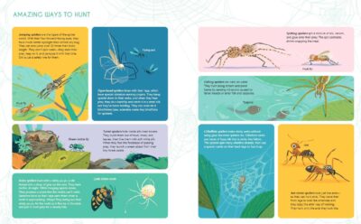 Stacey Thomas completes the information with brightly colored, but not popping of the page, illustrations. The minimally detailed cartoon-like images counters some of the more extreme information (how one beetle travels through a frog’s anatomy, alive and kicking, and out the “back door” and another might get eaten by the frog, but will be spit out, jump onto the frogs back and well, “take care of business” then dine on the frog. Therefore, while it is tastefully mentioned (and thankfully not shown as I am very sensitive to anything dealing with the spine), it might not be for the squeamish reader.