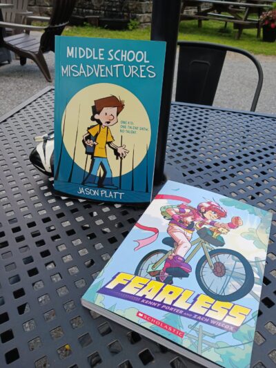 My weekend included too much laundry, a miserably cold and rainy Saturday, not feeling well but actually reading a few easy children’s reads (in between getting seating ready on the front porch finally). Granted, most were not huge hits, but Middle School Misadventures by Jason Platt was not a miss.