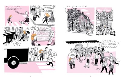 In the first few pages of Nowhere Girl, I felt like I had time traveled between several decades. First, the 1960s due to the reference of the Beatles and the feeling of the art and tone of the story. Then, the 1970s via the look of the city and again, the tone of the story and the Beatles. And then via the clothes we finally landed in the 1980s and 1990s. But then you have references to some pop culture when the main character and other girls, while walking home from school, are singing a Patrick Swayze song and talking about Patrick Bruel (don’t worry, I did not know who he was, either. And it was not the last time I would have to look up a person referenced as a hottie or singer. Except for the lead singer of A-ha, Richard Dean Anderson and one or two others). Finally, I settled that we were in the 1990s (because that is when it is set).