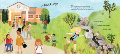 And we see Wendy as she grows up, learning how she has a couple different fossils/dinosaurs named after her, where she has traveled and how it was not an easy journey. We see all of this (and more) illustrated by Sandra Dumais. The illustrations are a combination of realism and cartoon images. They are colorful, but not overly overwhelming (though Wendy’s’ adult hair seems to mimic her uniquely strong personality.