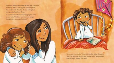 difficult as so much has been destroyed by warm. Plus, she has a “helper leg” (she lost her leg due to the conflict) that makes it hard for her to get comfortable at school. You see, they have no benches or chairs, and must sit on a tarp on the floor. And no matter what she does (and her is where some of the relatable comes in), she cannot get comfortable (now I do not have a helper-leg (which by the way I think is an awesome term) but have difficulties getting comfortable due to health issues). I loved how her mother and little brother (the image of him is absolutely adorable, so I have included it here) are supportive, and how she does not give up, but finds a way to make her situation better. And by doing so, makes the lives of her classmates better, too.