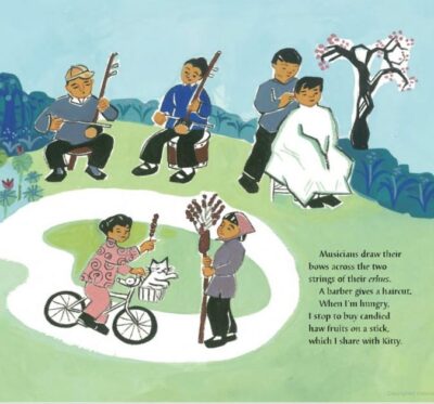 Belle Yang’s Angel in Beijing is really a simple story, but it is busy and filled with goodies. A young fil finds a cat one night, and after a while, they just name the cat Kitty (as no other name seem to fit). But one day, Kitty runs off. And not even the child’s bell on her bike, that Kitty loves to meow along with, seems to bring her home. But then again, home can have many meanings. And sometimes a surprise like finding a cat, can bring with it even more wonderful surprises.