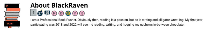 If you have posted a Bingo review, you should have a badge in your bio. BlackRaven has a 1 to reflect her bingo, everyone else should have a B.