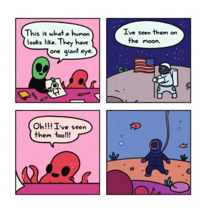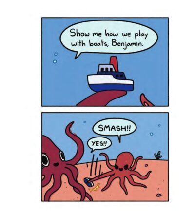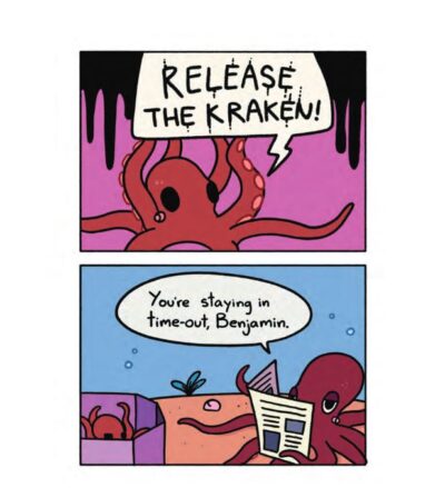 The artwork, like the humor is pure Andersen. It is off beat, a little “naughty” but never inappropriate. Well, not really inappropriate. It does depend on your sense of humor. She is not tasteless or bawdy, but the humor is adult leaning. But then again, when baby Benjamin yells, “Release the Kraken!” and Momma Kraken says, “You’re still in time out,” as we see little Ben in a playpen; anyone can appreciate that.