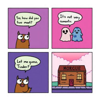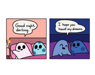 The illustrations are fun and sweet and funny. They are minimalistic, but expressive, too. The two ghosts are a haunt, I mean hoot, with one in their flowered sheet (and not to mention the irony of “til death do us part” as their wedding).