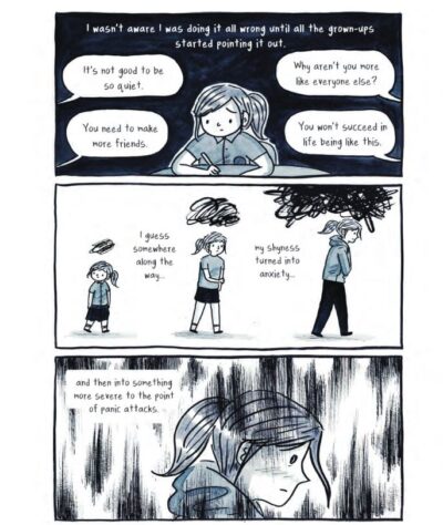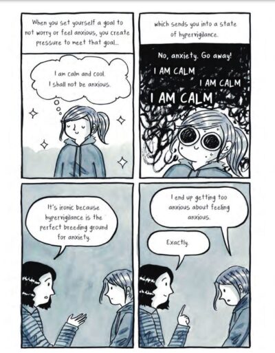 We follow the narrator as we travel with them learning about their anxiety and depression. We find the relatable ideas of trying to be perfect so you deserve love; trying to do all the things so you can be considered worthy; and overdoing it so your body rebels. But your brain (the one thing that knows you better than yourself)
