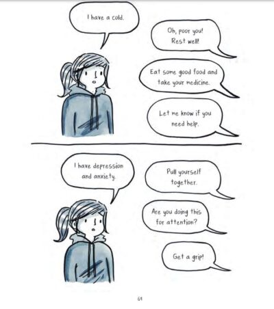 knows how to hurt you into thinking you deserve nothing good, you are a failure, you cannot complete simple tasks, and so forth. One of my favorite parts is how Tung tells us, she is not “sick enough” or “depressed enough” to be considered “sick” or “depressed” so why should she have these “bad days?” Afterall, people have it much worse than her. And luckily for our narrator, she has some friends and family (even if not everyone is on the same page, the at least eventually find the same book) that are willing to stand by their side as they travel through several months of this sea-saw-swing they find themselves on.
