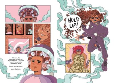 I will start with a controversial statement. I am not always a fan of the drawn natural hair look. For me, it does not “translate” well to the page. I feel something is lost from the “real look” verses the “page look.” However, in Frizzy Rose Bousamra really pulled it off. Marlene (our heroine) and her natural look is amazingly done. And Claribel A. Ortega’s story is equally wonderful.