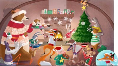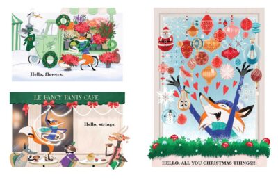 Basically, Fox steals the holiday goodies (the carrot on the snowman, the lights at the Fancy Pants Café). Terribly clever, but simple, illustrations are colorfully and gleefully showing the antics of the mischievous, naughty little fox and the surprised towns folk. Alisa Coburn’s illustrations are the perfect fit for this new picture book.