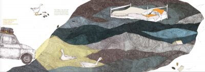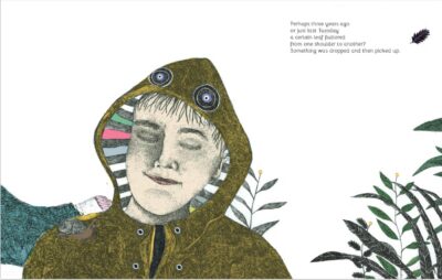 But the illustrations are fascinating. Now, I cannot say I loved them, but I appreciate the work of Beatrice Gasca Queirazza. The details are odd (why is there a snail on the person’s shoulder?), the images have a simplicity that is not simple by any manner, in fact, they probably are more complicated than one sees at first. They fall into the “take your time” category just as much as the text. At first, I almost found them off-putting and unattractive, but after the second read, I was appreciating them more, still I was not loving them.