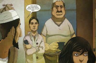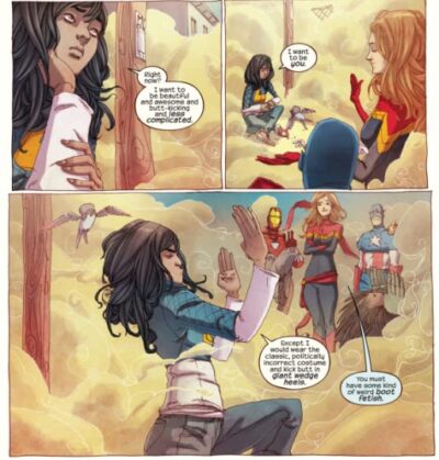 This is the first in this series. G. Willow Wilson’s Ms. Marvel is funny, sassy, naïve, pushy, a real kid/teen, who is trying to be a good daughter, not shame her family and still be able to go to a party. The one party she sneaks out to causes more trouble than it was worth: she is forced to endure the ugly of her classmates, gets a little sick off her first drink of alcohol (which she is not allowed), becomes lost going home, is caught in a weird fog, and starts to hallucinate. Or so she thinks. Visited by the images of Iron Man, Captain American and Captain Marvel, Kamala asks for the “perfect look.” And she gets it: blond hair, the un-PC outfit Captain Marvel used to wear, some kick-a$$ boots, big “talent” (like a police officer mentions about Captain Marvel later) and power. And with great power comes great responsibility, and a lot of learning curves.