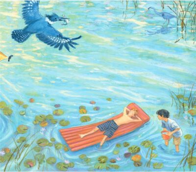 little slow at first, as while the illustrations are lush, soothing, they can also be busy, crowded and a bit overwhelming. And the body of the text does blend into the body of the artwork. But once you get into the flow of things LaMarche does not disappoint. Our story is how a few friends, and their families make a spot for rest, relaxation and for fun. The story is how those people were able to find a spot for wildlife to come back to the area. We see ducks, deer, and all sorts of creatures of a pond ecosystem. And we follow the seasons as it shows how it grows, breaths and lives. How the area is a “body” that is alive.
