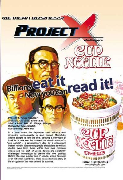 Sadly this book is out of print and completely unavailable, which is a shame (the one copy I could find for sale is $87, so unless you’re so moved by my review that you’re willing to pay that, this is out of reach for most people). I luckily got this copy back when it first came out in 2006 and it’s a cult classic for me that I re-read every few years. Project X Challengers: Cup Noodle tells the dramatic story of how Cup Noodle was developed. We learn about the high stakes — the company on the brink of financial ruin! Young engineers desperate for raises trying to do the impossible and create an entirely new product! — and then the manga walks us through the process of how Cup Noodle was created. I think why I enjoy this manga so much is because of how dramatic it is. The tension of each step in the process, from making the cup itself to figuring out how to get the right kind of shrimp, is expertly conveyed through the art, and there are a ton of problems I never would have thought of that they have to beat.