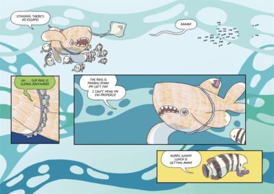 While we learn about subjects like sharks, ocean, climate change (or the koala or elephants in the other books) we are being entertained by the sweet, funny and while in a cartoon format, realistic imagery. Text and art are simple, but not simplistic and are a perfectly connected match. Great for the early readers to solid solo readers, this can be an all ages book as it is a graphic novel that can be read aloud.