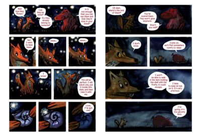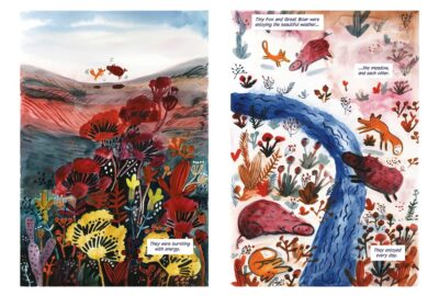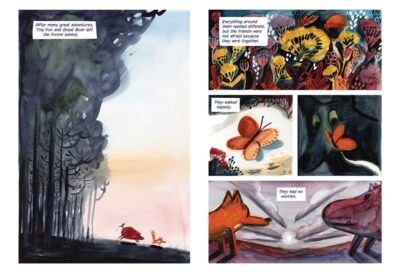 Tiny Fox and Great Boar Book Two: Furthest has three different stories that are connected. Berenika Kolomycka’s second book in this series is set in three different locations. The first is a meadow, the second during their travels and a foggy mountain, and the final one the seaside/the ocean. Now, it might have helped to have known book one, but this book does mostly stand on its own. The format is broken into three chapters that show the travels and adventures of two characters, Tiny Fox and Great Boar, two unlikely but close and dear friends.