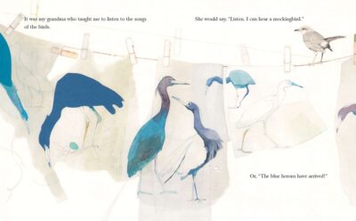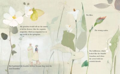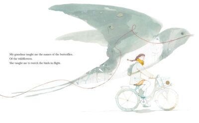 This is a sweet, but also somber, story of a grandmother and granddaughter and how they interact while observing the world around them. It is a picture book of how a grandmother teaches a grandchild how to view the world, explore the world, and to appreciate nature and the animals and plants that reside in it. This is a poem and love letter. On the pages of With a Butterfly’s Wings we see how secrets, appreciation and love are passed along and