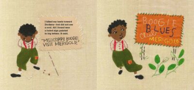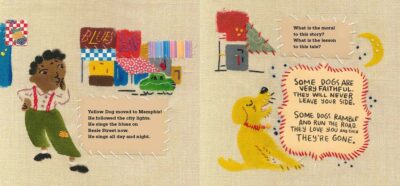 The publisher description also has this: With swinging free verse and stunning hand-stitched art, Yellow Dog Blues is a soulful fable about what happens when the blues grabs you and holds on tight. And this is what I liked about the book. It is fun, it is exciting, it makes you sing, move and groove. And Raschka and I have never been artistic friends, but this time the handstitched art is fantastic. I love how you see the cloth and the images are simple, but really detailed. Even the names of the author and illustrator are stitched. This is clever and very different. This unique twist to traditional art and illustrations will be getting a lot of attention.