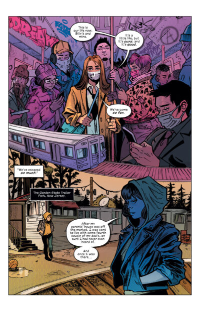 There are some triggers such as human trafficking, abuse, language, and at the end some fantasy imagery and violence occurs. But I felt it is there for the message and not to shock. And yet, it can be shocking. This is not for everyone because it is a little messed up, powerful and has a few potholes in the plot and execution. There are great images such as Maya, our heroine, starting her period in the middle of a party for “Women” yet the paintings on the walls show their “assets” and not their assets. The text is powerful and real (Guy: No girlfriend of mine would do that. Woman: she didn’t do it on purpose). And there is humor (Maya swears and her son calls her on it, so she owes him a dollar). You can say everything is over the top and it is. But that is the point, that humor (okay there is a fart joke, I admit I laughed, groaned, laughed) takes the edge off things, and still, you are in the moment. (And I have so many moments I loved and hated.)