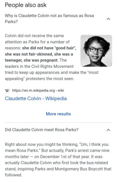 have kids, was/wasn’t married, etc.,” but highlights the events that were important. We see how Parks was an everyday person, but a fighter. We see how she spoke up, and how she felt about things like how she was not the first person to say, “I paid for my ticket and I’m staying,” but a young 15-year-old girl named Collette Colvin was, and how she was not the right “look” or background for the NAACP to support publicly. And, of course, there is much more.