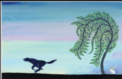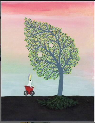 This book is a series of illustrations about a rabbit and a tree that have adventures. The tree scares off a wolf, the bunny digs up the tree to travel, they go up and down hills, meet a few things, see nature, and finally find several more bunnies to live with. Tree is replanted and we see the seasons happen. This road trip is both odd and straight forward. You make it up as you go along, but the author does point to a few things they want you to know. Really watch the tree as it changes expressions.