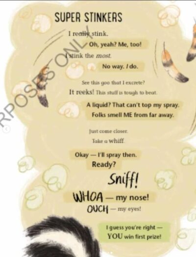 Linda Ashman and Aparna Varma (illustrators wonderfully done by) crated a book that has facts, little fiction, and a lot of fun. A page of facts follows a poem about different animals and the things they do. Chomp well, stink well, and so much more. I am partial to the stinking ones (okay, I like some of the chompers, too. And then there is the ones from the deepest part of the ocean who are pretty cool. The frequent flyer one is awesome. And then there is …. Well okay I think I like them all).