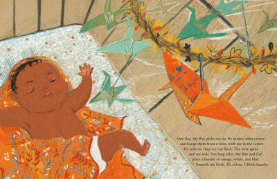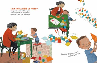 A boy’s grandmother shows him how to make an origami crane. Then, the boy and that colorful crane become very good friends after that. All of this is told to us by the voice of the Crane. It tells us all the adventures the two of them have in Love Made Me More. Colleen Rowan Kosinski’s story allows us into the mind of a favorite toy. The boy of the story does all sorts of things with the paper Crane and finally starts to outgrow the beloved item. We see how the boys’ interests change (the crane has a picture of a girl placed in front of it and later the dust) and it is not until many years later the crane finds itself in a new place, with a new special friend.