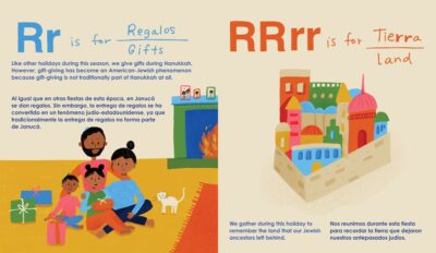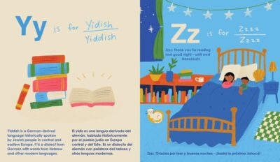 You see, this book is bilingual. Spanish and English words and phrases fill this alphabet book in ways you will be amazed at. Words you might know, such as L is for latkes, but also words that maybe do not translate right away to your English speaker, such as J is for Hanukkah. The Spanish first, English second and underneath the idea presented. The translation sometimes works for both languages, but sometimes you get oil for the letter A. It is clever, interesting, and filled with all sorts of wonderment. Melanie Romero took it all and had fun, while being educational.