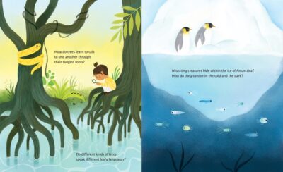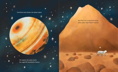 What Will I Discover is a combination science and philosophy story. Oh, I’m sure a few scientists said that there are only facts not thought in science, and even a few philosophers that said theirs is not “science” they study. Yet, there is both in both subjects. We follow a young child who knows that scientists know everything, but that is, until they don’t. And like how the narrator has told us that there is a mountain on Mars larger than Everest, they tell us the questions they do not know answers to, like how do trees talk to each other through their roots and do each tree have its own language? (Actually, I want to know that last one too). And the child’s biggest question cannot be answered by any scientist of today, which is “What will I discover?” as only the narrator/us the reader knows that answers. Tanya Lloyd Kyi’s clever and cute text is wonderfully, colorfully, and sweetly illustrated by Rachel Qiuqi.