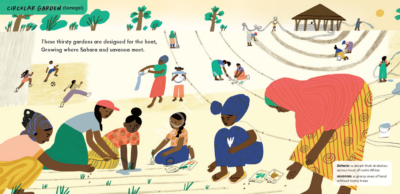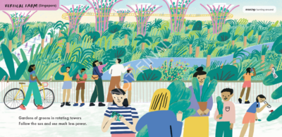 This picture book might be the closest some people would get to the experience of creating, making, and growing food. But it hopes to inspire us to do what we can in this journey. We follow “eco-friendly farms around the globe” (from publisher text) in a simplified manner, but all that is needed is there. The different foods and places presented are introductions to the world of food. We travel from urban gardens to Singapore and more. What I call, “info side boxes” pop up to help define vocabulary. Little pieces like that allow this to be accessible to all ages, and to grow with the child.