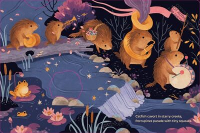 The publisher description of Moonlight Prance says it best: Foxes, hedgehogs, and other nocturnal animals come out to dance and play at night, in this rhyming bedtime story with tabs to pull and push.