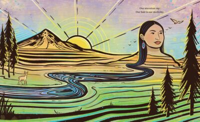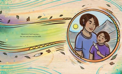 My Powerful Hair is a lovely story. Granted, I was looking for a more factual and less poetic story abut the meaning and importance of what the title meant, but it turned out just fine. All that information is given as a young child talks about how growing her hair out and why it is short to start with, is important to not just her, but her family and culture of her people. The culture of this child and her people unfold onto the pages that are boldly colored with a medium number of details. Steph Littlebird mixed realistic and fantastic imagery to tell Carole Lindstrom’s tale. The artwork is as poetic as the text itself.