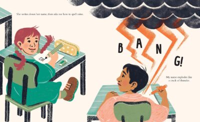 Sandhya Parappukkaran celebrates their Kerala Indian heritage in The Boy Who Tried to Shrink His Name. They also allow a bit of food to slip onto the page to show some of the culture our character is celebrating. And this is illustrated by Michelle Pereira’s illustrations. They are clever as Zimdalamashkermishkada tries to fold his name like origami, or shrink it in the dryer, but it will blow up like a scared puffer fish or exploded out. And the are not overly crowded, but they fill the spaces, but where they are spaces, those are important, too. It might sound like I do not like this book when I say they are nice, but they are not the “plop-it-down-flat-nice” but the smooth-slide-nice.
