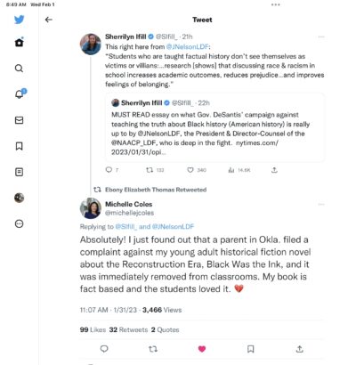 On February 1, the first day of Black History month, the news hit that fascist Governor DeSantis disapproved of the curriculum for the AP African American History course and would ban it from being taught in Florida. Not long after this story aired, it was revealed that Florida officials and AP officials had been negotiating the content of this course for some time and it looks like the AP/College Board basically caved to reactionary political demands and agreed to censor the course. Anyone familiar with the history of the College Board/AP should not be surprised by this; the College Board and standardized testing have pretty solid roots in racism to begin with, and they exist to make money first and foremost. AP courses being taught/money being made is more important than ensuring that their courses contain important factual information and meaningful content. As I was scrolling through my Twitter feed on Feb. 1, I saw this exchange between Sherrilyn Ifill (former president of the NAACP Legal Defense Fund) and an author named Michelle Coles: