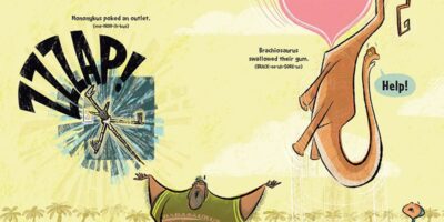 In all seriousness, this is a whale (or dinosaur) of a tale by Ame Dyckman. So, in other words, right up her alley of fun, goofy, and a good time storybook. It tells you the different dinosaurs (with a pronunciation guide) and a big, ol’ loveable, hairy dad telling the wild child of his how dinosaurs had to learn their lessons the hard way. The mom is not on board (at first) but she comes around to the tall tale eventually. And the day at the museum is fun for all.