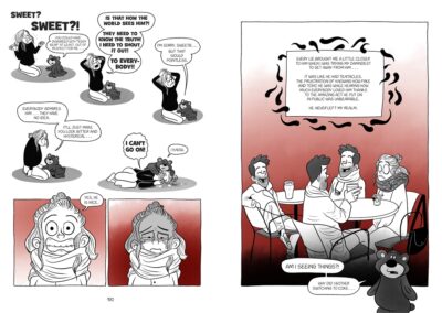 There are a lot of triggers in this book. Lambda shows you the progress of the relationship. Knowing the theme as we do, we can see the red flags, but of course Sophie does not want to. The first two parts are the honeymoon phase and the abuse phase. We see the triggers of Manipulator’s lies, his wording, his facial expressions, his actions (more than once he threatens to take his own life). There are possible triggers of alcohol use (both by the author and her conscience, Chocolat her childhood teddy bear, drink. And Chocolat is borderline alcoholic. Therefore, you can decide if Chocolat is the comic relief or really what was happening) and at least one scene of intravenous drug use (I am not sure if she exaggerated to make a point or had partaken, but it was obvious what was going on). There is also smoking (be in legal or illegal, I wasn’t sure). And a couple scenes could be triggers, such as we see how her physical health takes a turn because of the mental abuse. And at least one scene she is totally “zombie looking” with an eyeball hanging out.