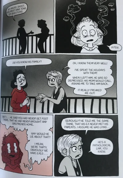And the final third of the story is the more technical aspects. We are given the book on the Manipulator. She breaks it down, so we are aware of what was happening in her personal journey. She is almost giving us a pamphlet of tips, clues, and solutions. She even explores her own responsibility in the situation. One of the most powerful scenes is how she says that the Manipulator did not force his way into her life, but she opened the door and gave him a seat in first class. And to help herself heal, she had to explore that (which she did with a trip to Italy and a 300-page graphic novel). This of course, is going to be controversial, but I related to this part more than any other as I had my own poopoo head and, I too realized, I gave him the reins and had to realize how to stop that for my own mental health.
