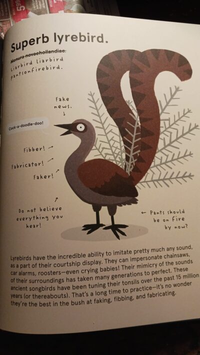 This book is amazing. It includes information about the fascinating adaptations of the animals presented. Some are funny, some are spooky, and some stinky. And while I am glad the real images are not included (looking at you, Mexican mole lizard!) sometimes the drawings do not show all I wanted. The jokes, puns and facts were a treat. Sometimes the crossing out of a word (as the word Marvelous in the title, why I put in parentheses), got a little old (and I never saw who did that, or why, as it happens on every page) and a few puns/jokes were pushing the not-so-funny line, but overall, I was enjoying myself (and yes, you probably do need to be a “chameleon years old” to get the chameleon/Boy George joke).